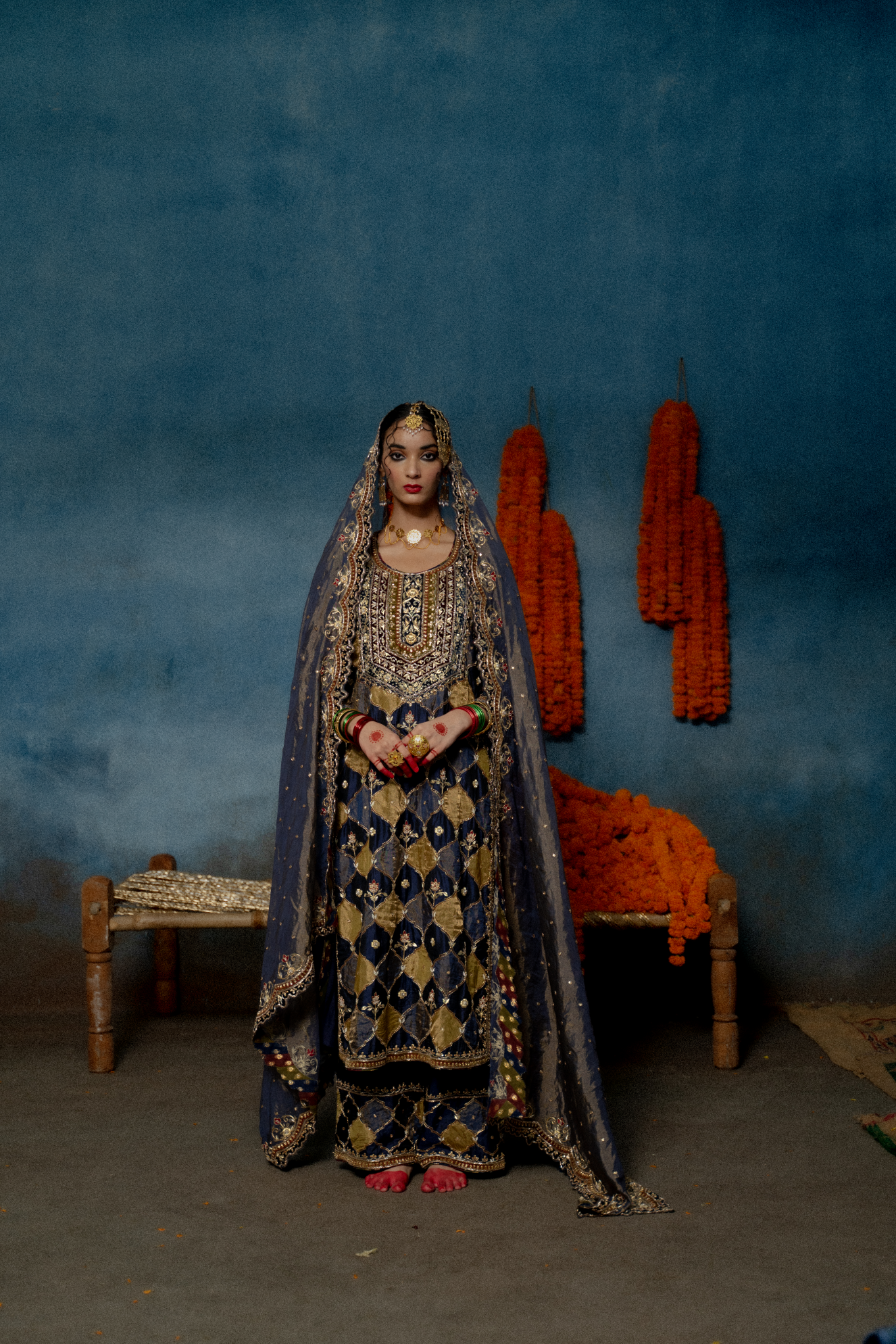 Borrowing colours from the past, this traditional " नीलम " hued ensemble is an ode to the old school craft of “Tukdi” and “zardozi”. Detailed with Mehraab-tukdis over pure silk kurta and a scalloped tissue-silk odhana ,this ensemble is a reflection of our shared past.